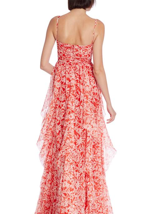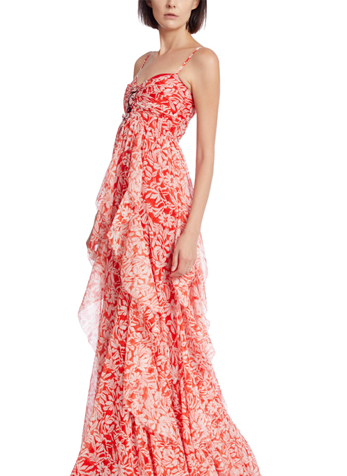 Printed Cascading Ruffle Gown with Embellishments