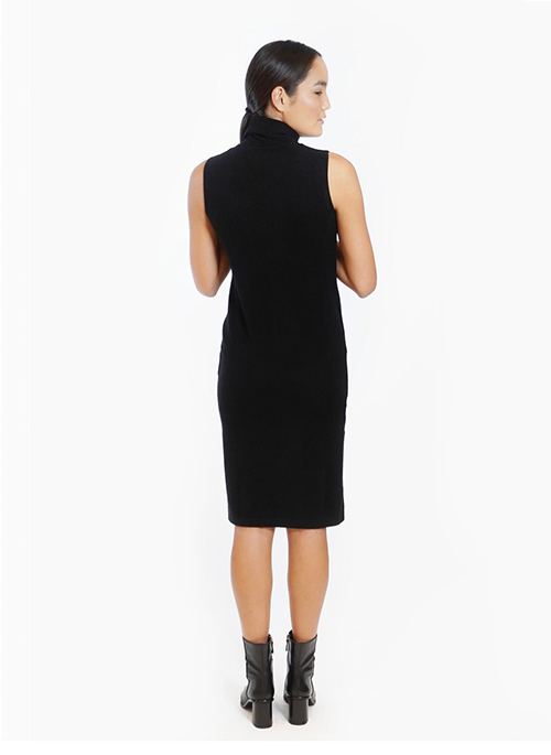 Elegance best describes this sleeveless turtleneck midi-length dress.