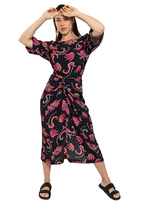 Mid-calf length skirt, with a draped knotted waist. Center back split, straight silhouette and hidden back zipper.