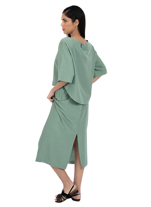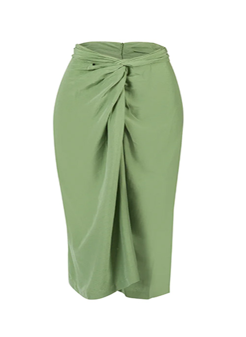 Mid-calf length skirt, with a draped knotted waist. Center back split, straight silhouette and hidden back zipper.