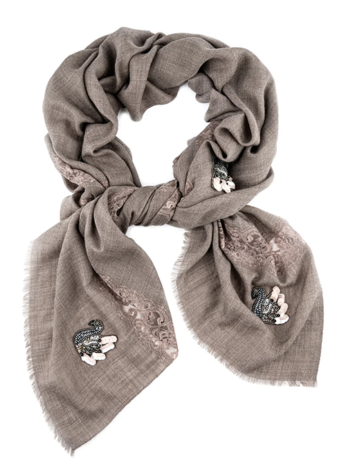 This taupe scarf, crafted from a very soft wool and silk blend, features tone on tone lace panel cutouts. It is further highlighted by exquisite hand-embroidered swans made by using sequin. With wispy eyelash fringes at the ends this is a unique scarf that elevates any outfit year-round.