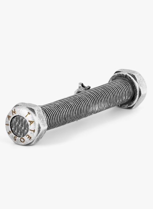 This brooch is inspired by industrial bolts to add a super cool, ultra-masculine look to your suit. The sleek oxidised finish of the bolt has been offset with two hanging curb chains. From the toolbox to your lapel, the half-cut bolt should be worn at a diagonal for maximum effect. Oxidised base metal with a brushed finish and cast detailing,