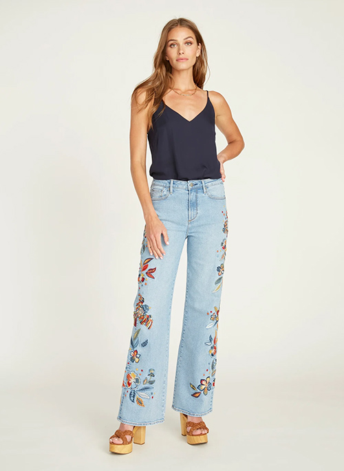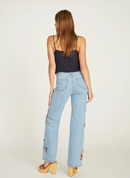 Not-so-traditional. The flattering Charlee light wash wide leg jean, made unique with Folklore colorful embroidery down each side of the legs and a bold bird on the back.Details: