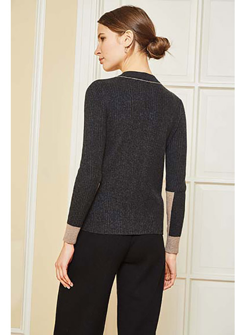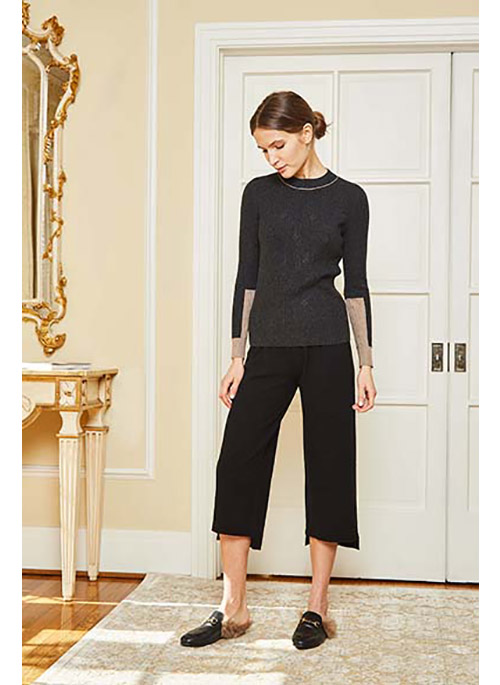 Ribbed mono knit with contrast color trim and detailing on the front. Fitted body. Round neck.