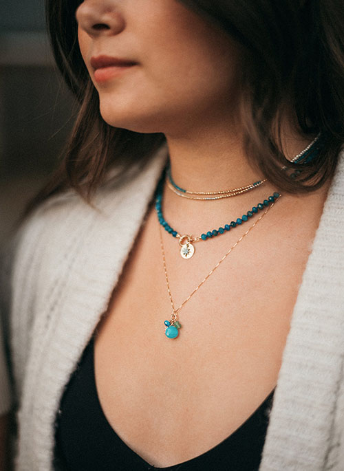 It's all about adding color (even if your fav. color is black)! Apatite faceted rondelle stones have a gorgeous Blue hue which still goes with everything...These add just the right amount of color and sparkle, with a mix of sophisticated and boho. approx. 17" of beautiful stones, knotted in between each one, and a diamond starburst hanging over a polished gold disc creating beautiful movement. Gorgeous Fancy Anchor Spring clasp worn in the front.
