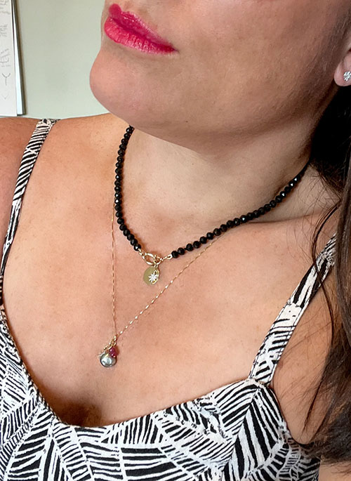 It's all about adding color (even if your fav. color is black)! Spinel faceted square rondelle stones go with everything...These add just the right amount of shiny and sparkle, with a mix of sophisticated and boho. approx. 17" of beautiful stones, knotted in between each one, and a diamond starburst hanging over a polished gold disc creating beautiful movement. Gorgeous Fancy Anchor Spring clasp worn in the front.
