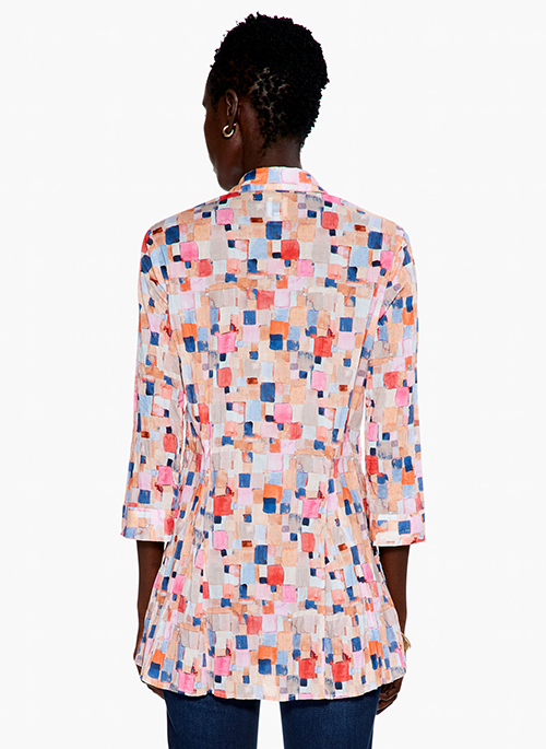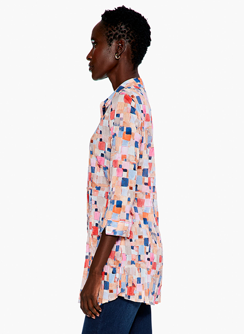 A collared button front top that'll take you far: all the way to tunic length in fact. Wearing it as a top or a fun, swishy layer, we love this piece's inviting geometric print. Made from 100% cotton with slight shirring detail at the hem and the cuffs. And it's Mindfully Made, so you can feel as good about wearing it as you feel comfortable in it.Details: