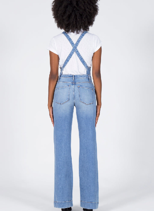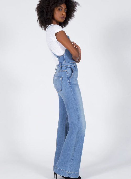 Change is good. This overall is skinny throughout the leg and opens into a groovy flare. Paired with adjustable straps and a side zip closure and comes in a clean light blue wash.