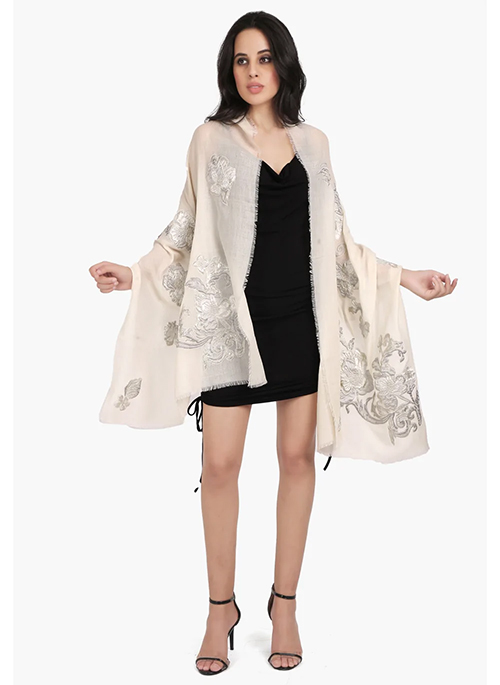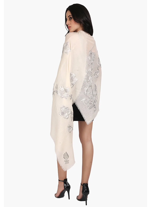 This striking ivory scarf is woven from a very fine cashmere and adorned with contrasting grey and silver flower appliques in lurex. With wispy eyelash fringes, this is perfect glam accessory over a LBD whilst keeping you comfortably warm.