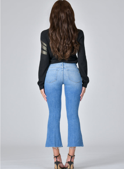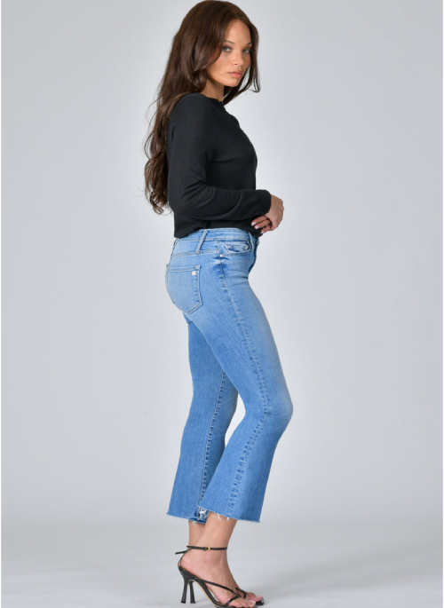 The Chrissy kick flare is a fresh take on our cropped flare silhouette with a raw hem. Cold Hearted is medium wash denim with hands and and whisker details that you are sure to get a kick out of!