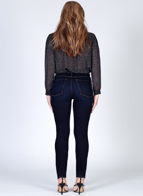 Our button-front skinny comes in a dark wash with a button fly.