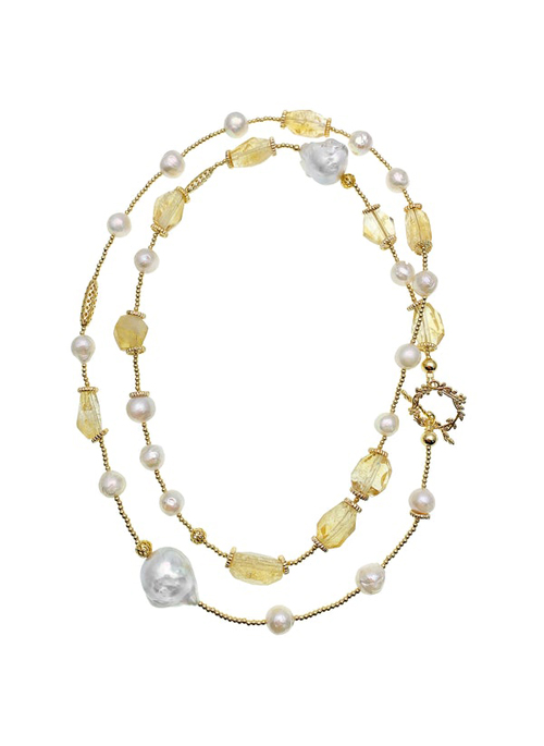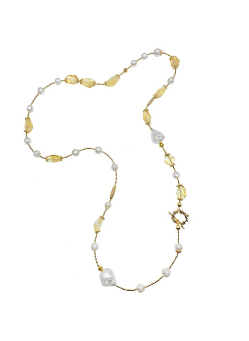 This handmade necklace is made of citrine, baroque, and freshwater pearls with gold plated brass findings from Japan. The color and craftsmanship of this necklace are so beautiful, it can be worn with a blouse, dress, or knitwear from day to night for any occasion. Match with our Farra citrine or freshwater pearls earrings to complete your look!