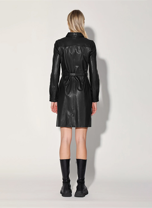 The Clara dress is a slim and sexy take on the shirt dress. This collared button down leather dress with tie waist detail will bring out your Femme Fatale.