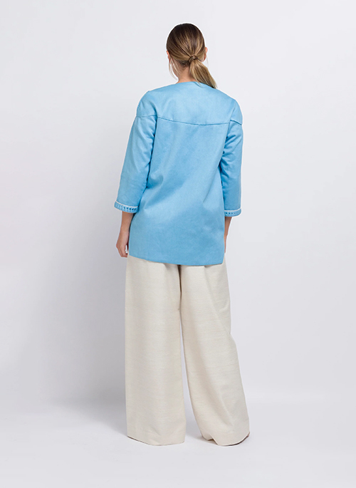 A relaxed jacket thats perfect to wear for a stroll in the park or whilst running errands. The front of the jacket is decorated with a contrast top-stitch and bottom panel embroidered with cross-stitch giving it an artisanal vibe. It has an elegant block-print lined finishing making it beautiful inside and out. Pair with a pair of jeans or our co-cordinated high-waisted trousers and boots for a more elevated look.