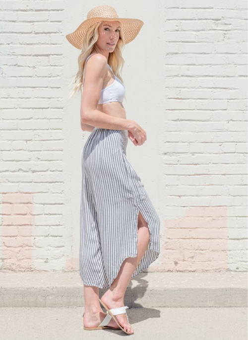 A staple and customer favorite, the Classic Capri carries a front yoke panel with a wide leg that falls to the ankle. The leg features three buttons on each side to leave it unopened or to close for a more tapered leg. Perfect for travel for your yoga and to transition from a funky day to night outfit!