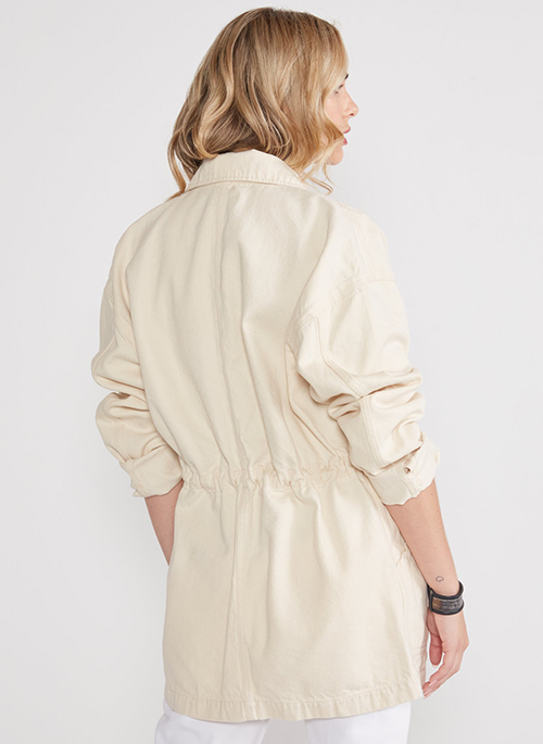 A soft spring jacket with utility pockets and a hidden drawstring for a customizable fit.