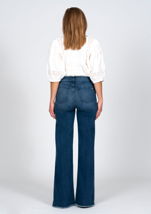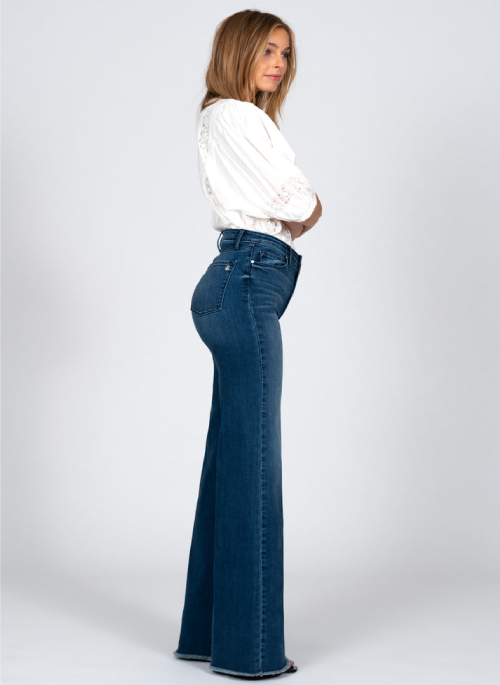 Keep it classic in our best-selling wide-leg jeans! Make it right is a true indigo wash, finished with a heavily frayed hem. These jeans are also made out of liquified material to hug you in the right curves.