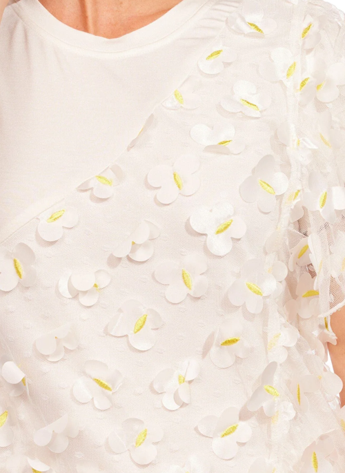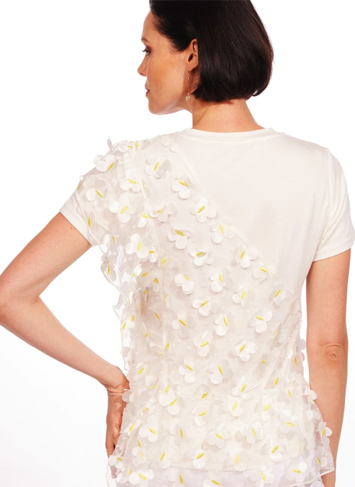 The Cleo Top is an innovative style that blends soft jersey T-shirt with a structural one-shoulder overlay in our Daffodil Petal fabric. The overlay has a ruffle that cascades over the shoulder down to the hem and is made of 3D petals with yellow center embroidered on a mesh fabric. There is a drawstring integrated to cinch the waist. Dress it up or down, this white top will be comfy and stylish.