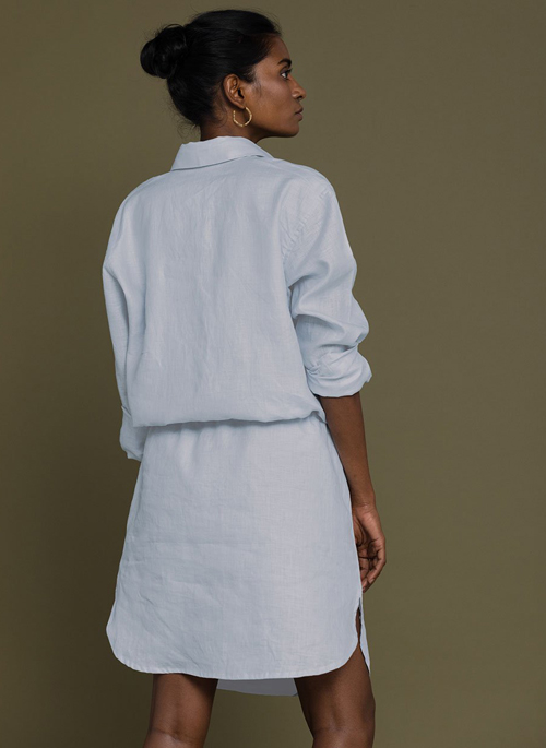 Subtle sophistication and contemporary style come together in this collared shirt dress with a drawstring waist and oversized front pocket.