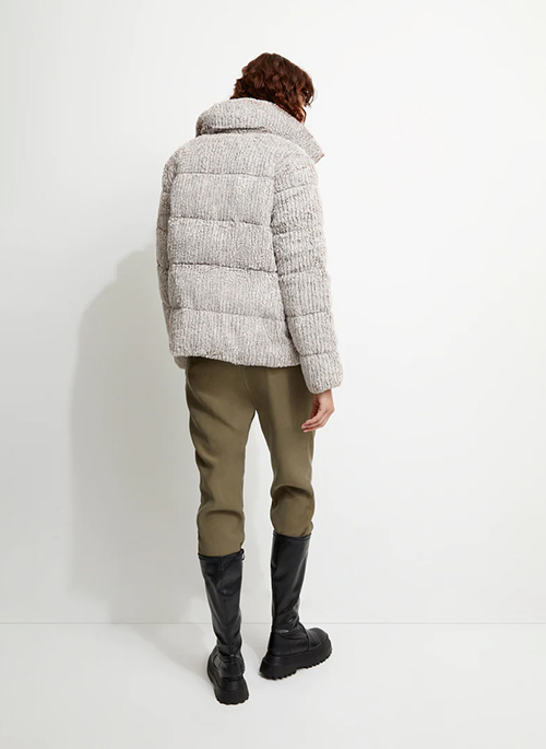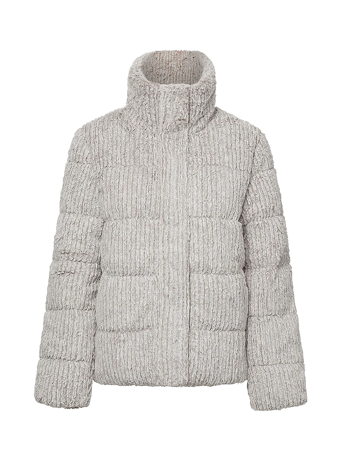 This close-knit puffer jacket is constructed in a classic puffer jacket silhouette in an ultra-soft corduroy outer shell. This puffer features a micro faux fur woven fabric, a quilted bodice, and vegan puffer filling.