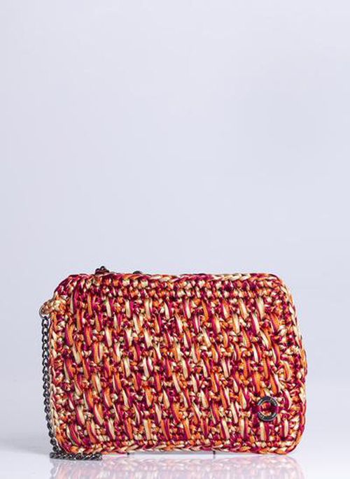 Handmade crochet wallet with satin threads. Comes with a 45 cm chain loop, zipper closure on the inside, logo and card holder. Signature Catarina Mina details are displayed on this stylish bag.