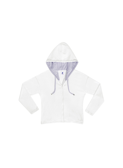 • Hood with cord in navy and white striped cotton, chrome metal end caps, to tie