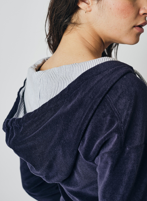 - Hood with cord in navy and white striped cotton, chrome metal end caps, to tie