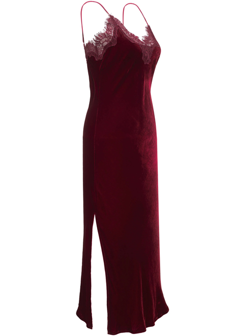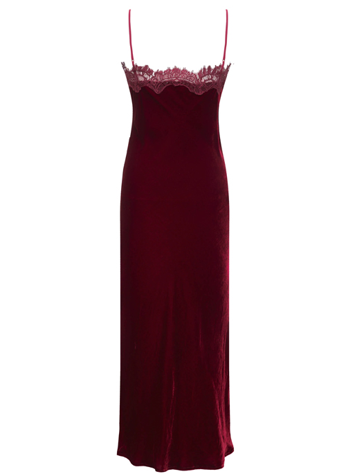 An absolutely stunning full-length/maxi velvet dress with a V Neckline embellished with Gold Hawk's signature Coco Lace. This velvet dress is cut on the bias, has adjustable straps, and has leg slits on both side seams.