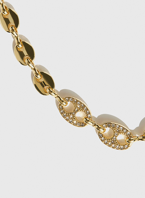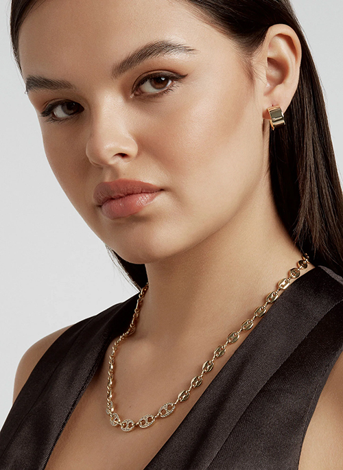 Half classic, half bold. This elegant necklace is a super classic from day to night. The Coffee Beans necklace is a maxi minimalist accessory designed in a luxurious chain with a touch of crystals in pavé as a center piece. As statement layers are on our radar for 2023, this one was designed to be stack with our Coffee Beans Pavé necklace. A new gem for your events.