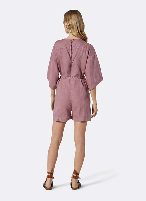An elevated romper that evokes endless summer dreams with its streamlined silhouette and air linen cut. The Colin features a front button tab closure, flowing sleeves, and a self-tie belt for added shape.