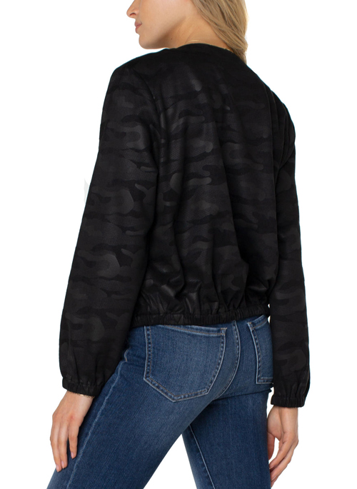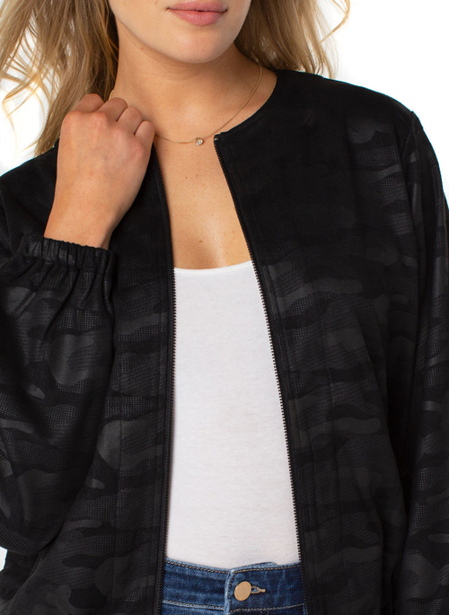 A versatile and fashionable jacket in our beautiful subtle black camo print! A unique item that can pull your outfit together! Pair it with the matching pull-on trouser for a polished all-in-one look!