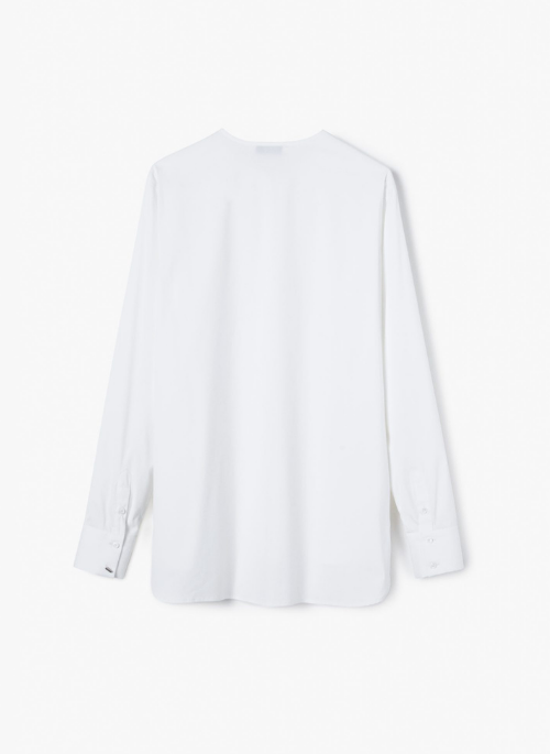 Collarless straight-fit shirt with long-sleeves and cuffed cuffs. Thought to match our pleated-detail bib vest.Details: