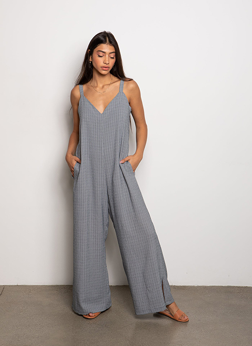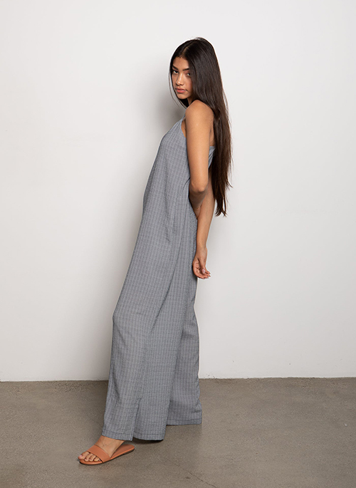 A simple look with structured details, this tank style Colline jumpsuit--featuring front v-neckline and zipper back closure--is cut in a casual, Navy Check fabric.