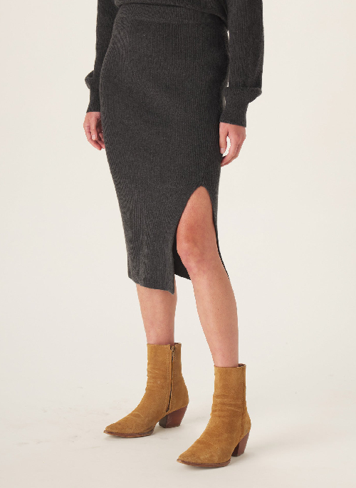 This ultra-soft midi skirt will make you never want to wear a suit set again. Perfect dressed up or down, the sweater knit gives this skirt a structured look, without the stiff fabric. Wear it with our Collins Knit Crew Neck sweater, or pair it with a knotted tee shirt for a more casual look.Details: