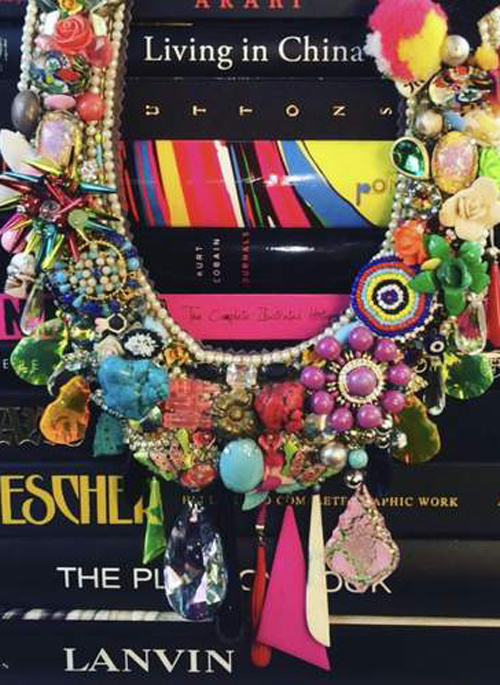 This showstopping, one of a kind collar necklace has a hand-beaded embellished overlay with assorted flowers, stars, pompoms, gems, metallic spikes, and sparkling rhinestones on a pearl base. The backing is a smooth, vegan leather fabrication with printed silk adjustable back neckties. This amazing necklace will add pizzazz to the most basic white t-shirt and look even more fabulous accessorized with a floor grazing maxi dress. This statement necklace is one-of-a-kind and handmade with love in Los Angeles. This work of wearable art ships in a protective fabric pouch bag.