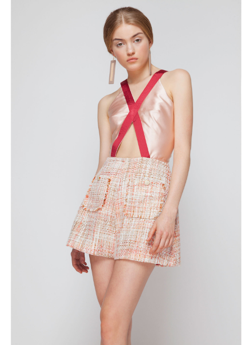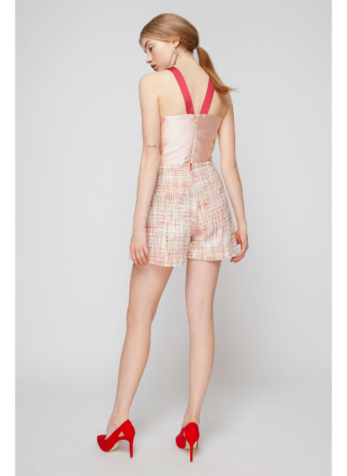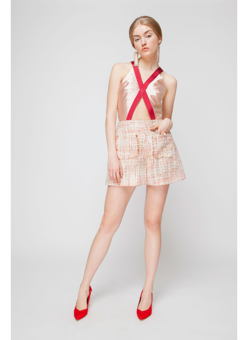 This V-necked top with cutout will be your number one choice for this summer. Featuring colorblocked straps forming an X on the front and a V on the back. The cute midriff cut out creates a peek-a-boo effect. Can be worn either inside or out of a high waisted skirt, pair of pants or shorts. It is fully lined with cotton lining. The top belongs to the "Chromocracy" SS Collection, chroma being the greek word for colour.