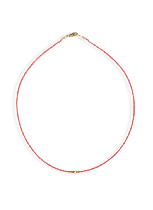 One strand of tiny coral beads, with an 18ct gold vermeil rondelle charm in the middle. This necklace is perfect for stacking with other items.