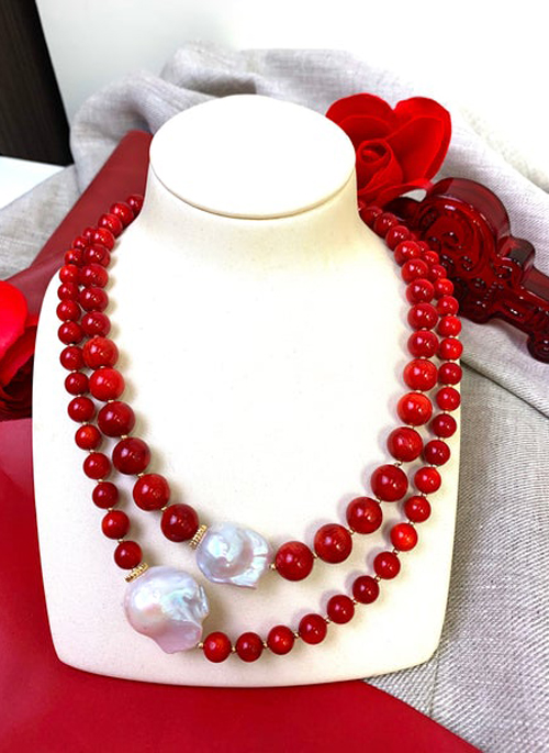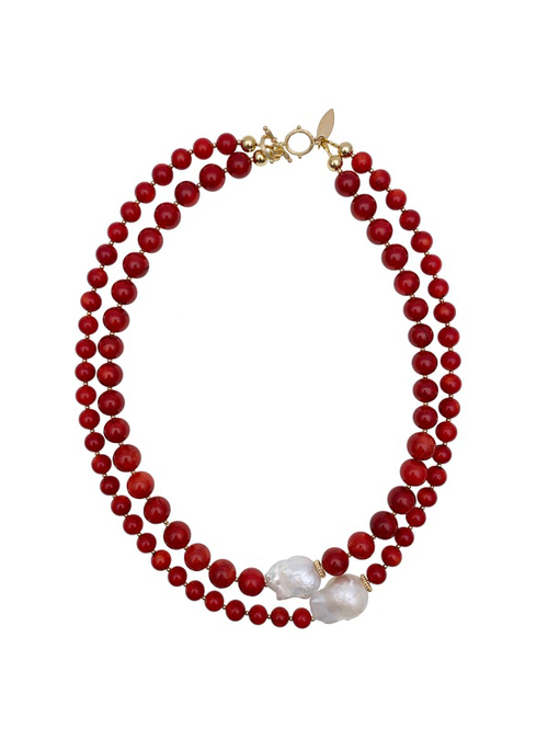 This handmade necklace is made of red corals and baroque pearls with Japanese gold plated brass findings. It's beautiful and brilliant. Match with a midi dress, tube top, or knitwear. This can be worn from day to night, for any occasion. Match with our Farra earrings to complete your look.