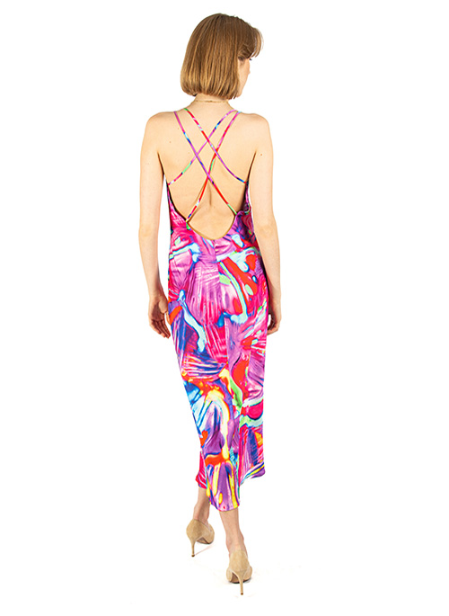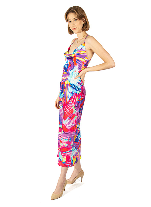 Cowl back midi dress in a silk touch fabric with a luxurious sheen.