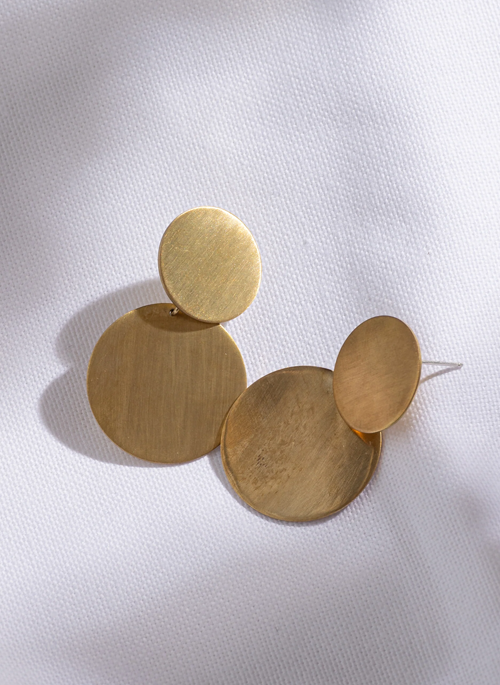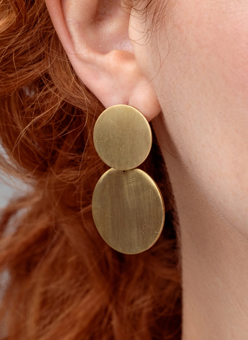 The word coterie means "a group of people who form a close association". The Coterie ear studs are also designed according to this motto. Two brass discs are placed tightly one on top of the other and connected, as they move they catch the light.