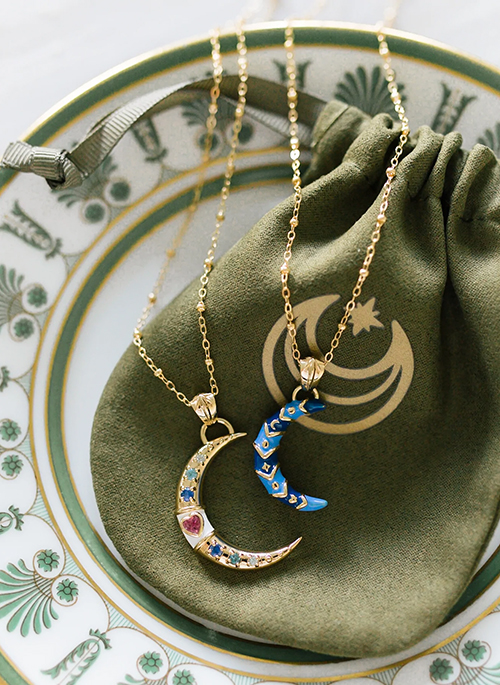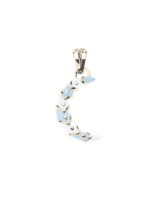 Forever find your way home to me - forever my friend, forever finding the true North to your life. This crescent moon charm pendant is the perfect pop of color to layer onto your neck mess - either a moody blue palette or a lighter white and pale blue colorway. Accented with pops of gold dots, moons, stars, and hearts.