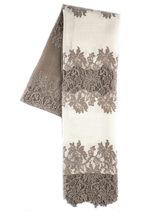 This chic dual colour ivory and taupe scarf is crafted from an incredibly soft cashmere. It features bands of partly contrasting and partly tone on tone natural hibiscus lace cutouts, which is sure to elevate the look of any outfit.