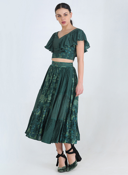 Green Mul Printed Crop Top With Ruffled Sleeves