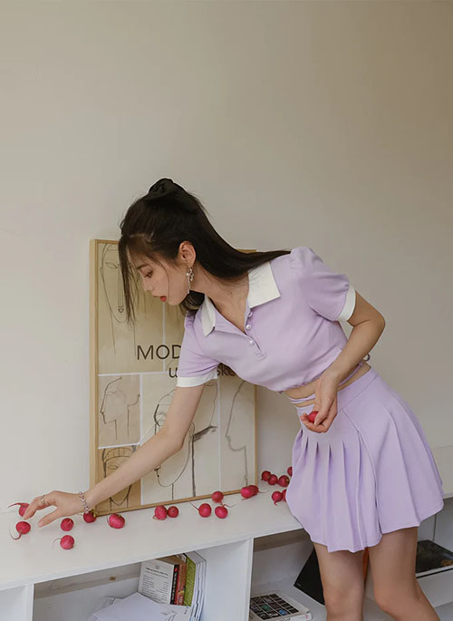 - Collared neck & Cropped profile with wraparound tie at waist & Pearl button