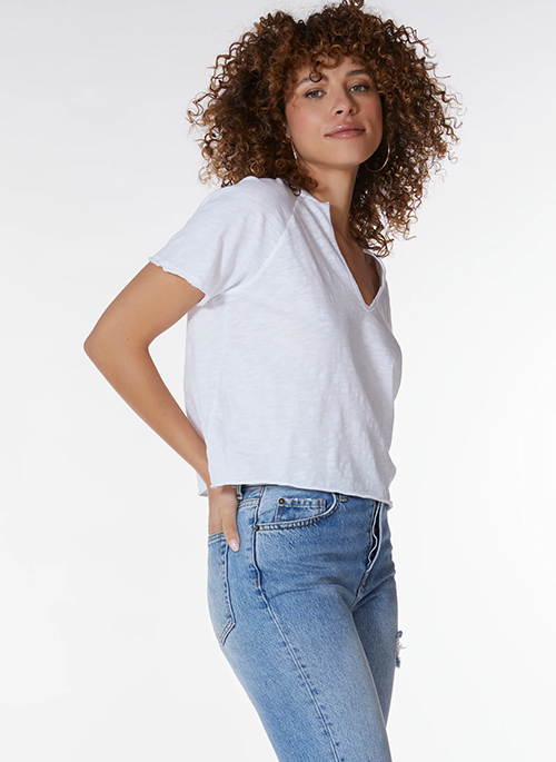 This cotton slub fabric shapes this tee with a deep split neckline, short sleeves, and a boxy silhouette that is a slightly cropped length. Raw edge details at the split neck and sweep give this tee an edgy vibe, finished with rib at the neckband.