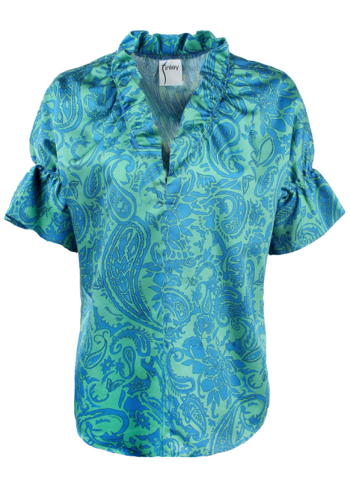 Popover blue & green patterned short sleeve blouse, featuring an elasticized ruffle collar and sleeve detail