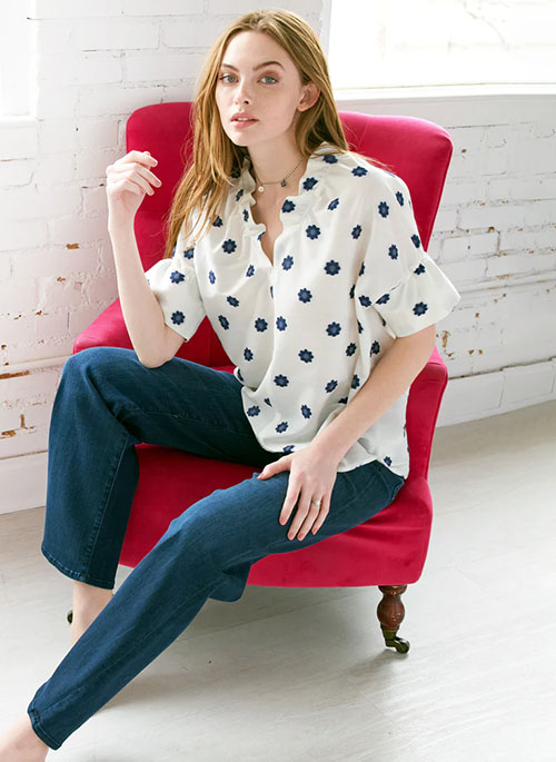- Finley "Crosby" blouse with daisy floral appliqué and ruffle trim along the neckline