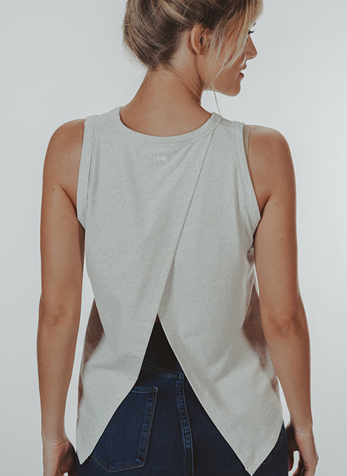 High-neck cut tank top with overlapping angular back pieces for a dynamic multi-wear fit. Tie it up with your favorite TNB leggings to enjoy a more fitted look with a keyhole back opening or leave it down for a relaxed fit and super subtle open back effect.