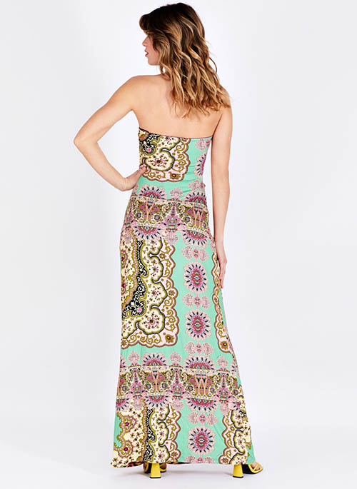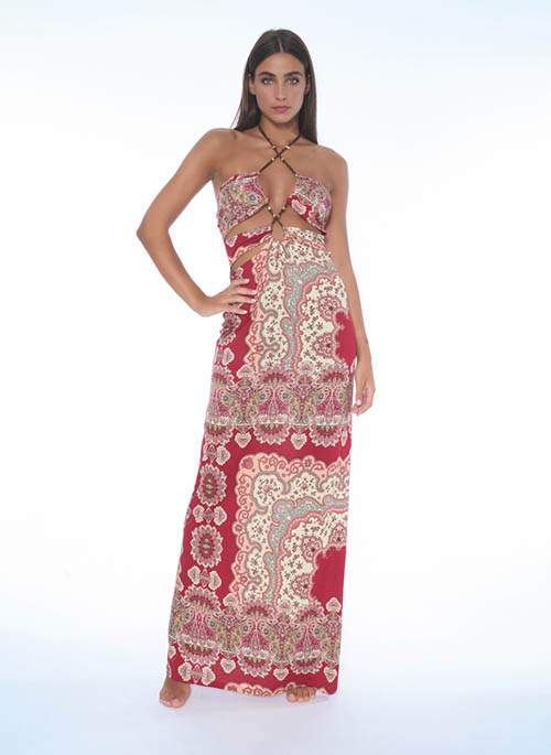 An innovative and enveloping design characterizes this super cool long dress. Cut-out details and thin laces enhance the silhouette in a game of sophisticated weaves. L timeless cashmere print embellishes this long dress giving it an elegant and seductive appeal. Choose to enhance your femininity with this long dress and stand out on every occasion.