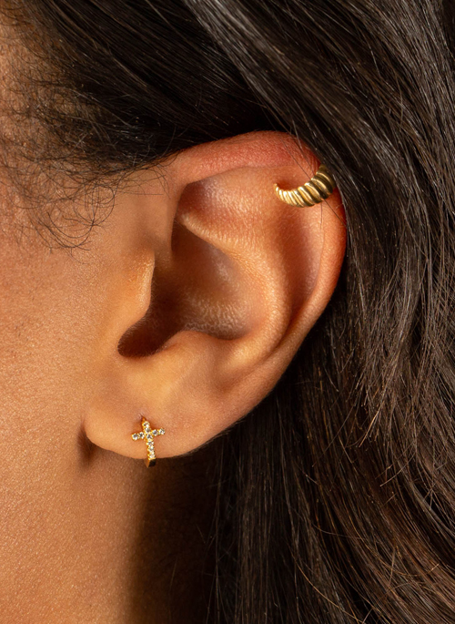 Flaunt a sparkling accent of your style with Adina's Tiny Pavé Cross Huggie Earring, featuring a glittery CZ cross pendant set into a slim huggie. Stack up the look with a couple of huggies and a pair of hoops for an elegant view.